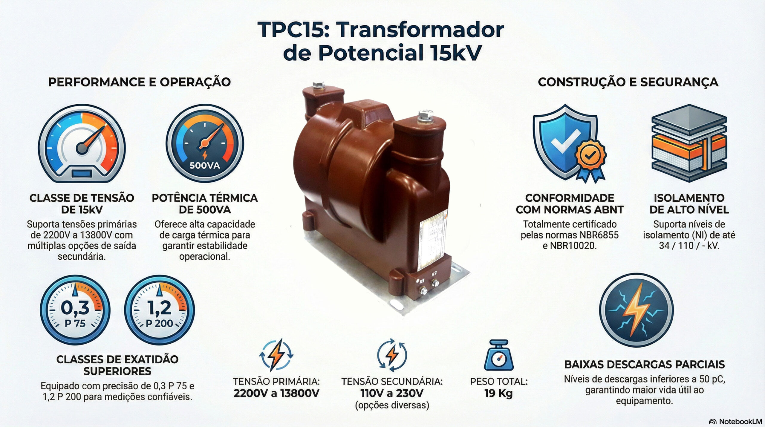 A exatidão em um TP não é meramente um requisito normativo, mas o pilar que sustenta o comissionamento de sistemas de medição e proteção. O TPC-15 destaca-se pela sua versatilidade técnica, oferecendo classes de exatidão que atendem tanto à necessidade de rigor financeiro quanto à robustez necessária para atuar em condições de falta.
